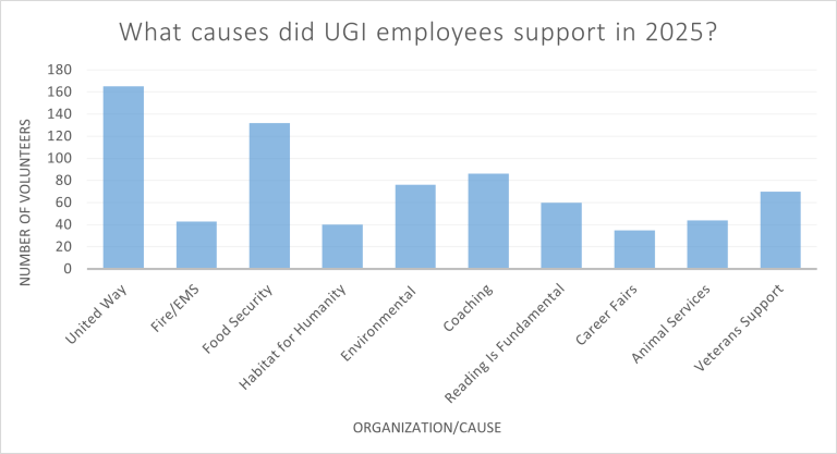 In 2025, over 600 UGI employees provided over 30,000 hours of volunteer service in our communities, both at UGI-organized events and during their personal time outside of work. Those efforts supported UGI Utilities’ four key focus areas: Improving Literacy, Inspiring Future STEM Professionals, Building Future Leaders, and Supporting Safe and Sustainable Communities. By focusing on these four areas, UGI can make a concentrated, impactful investment today, for the next generation and future potential workforce. In addition, employees volunteered to support personal causes including Veterans & Military Support, Coaching, Fire/EMS, and Animal Services, to name a few.